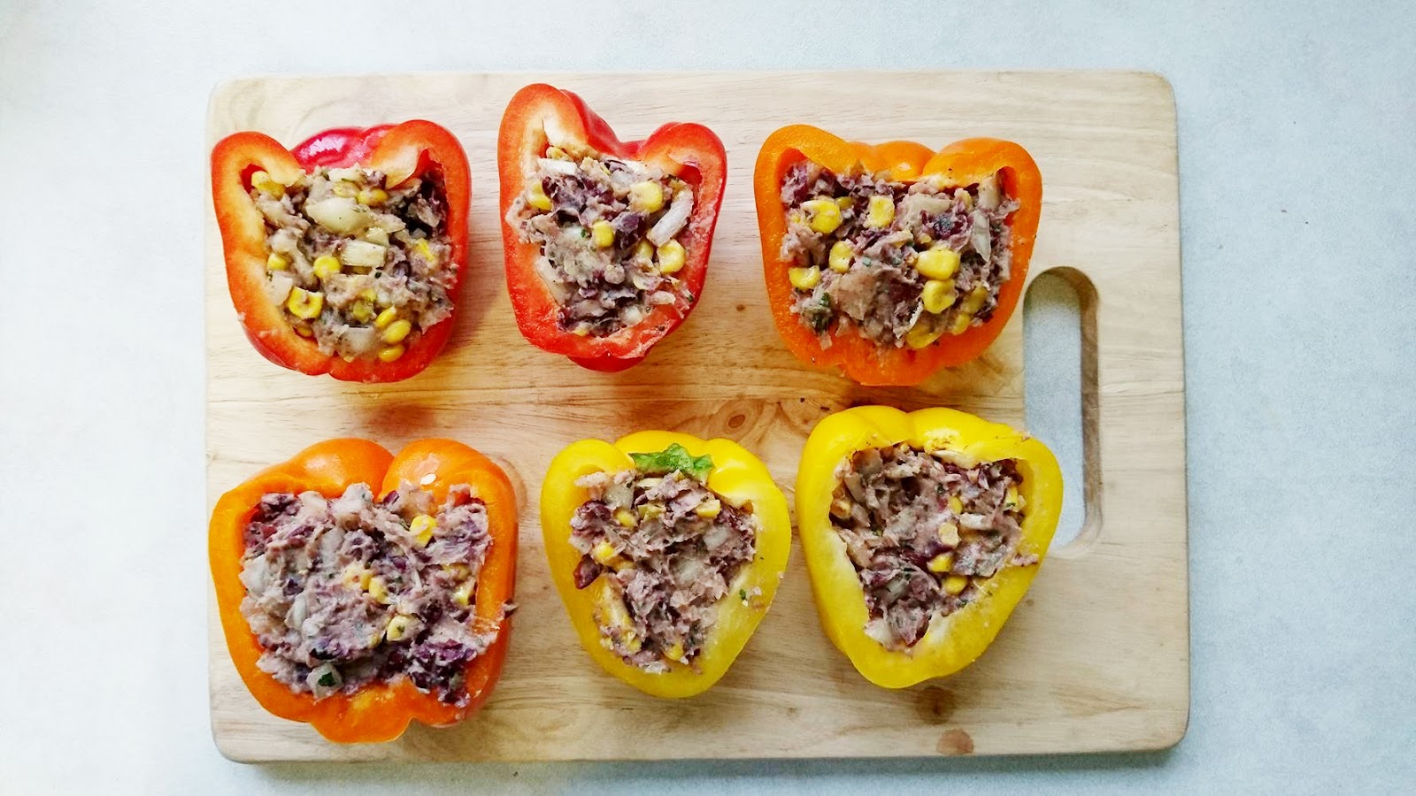 - prepare all your vegetables: chop the peppers in half and take out the core, dice the onion, drain the kidney beans, drain the sweetcorn, dice the garlic and chop the parsley;